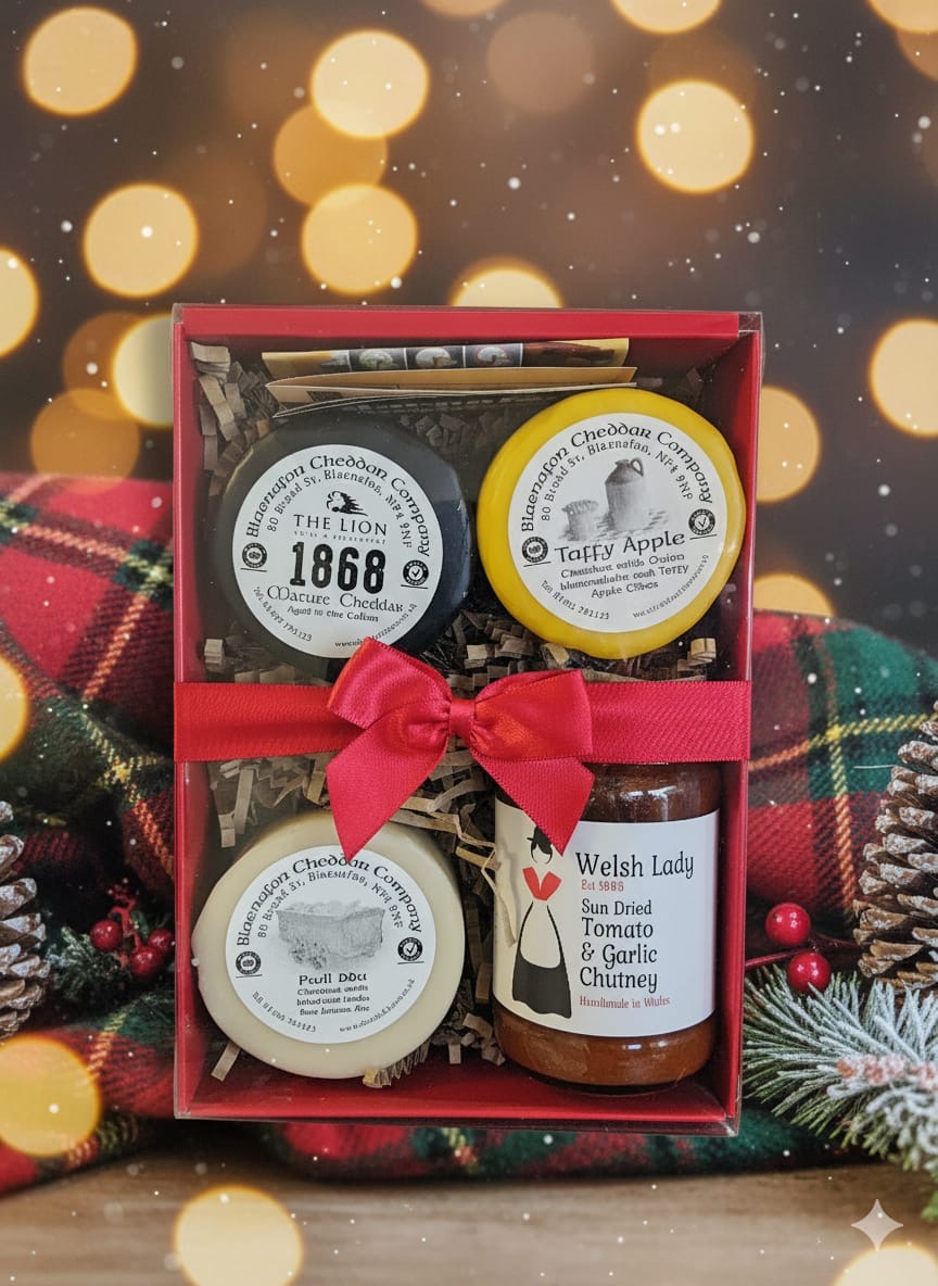 Containing 200g of each of the following; TheĀ Lion Hotel & RestaurantĀ 1868 mature cheddar, Capel Newydd, Pwll Ddu and a chutney. Weight: 3 x 200g Cheeses